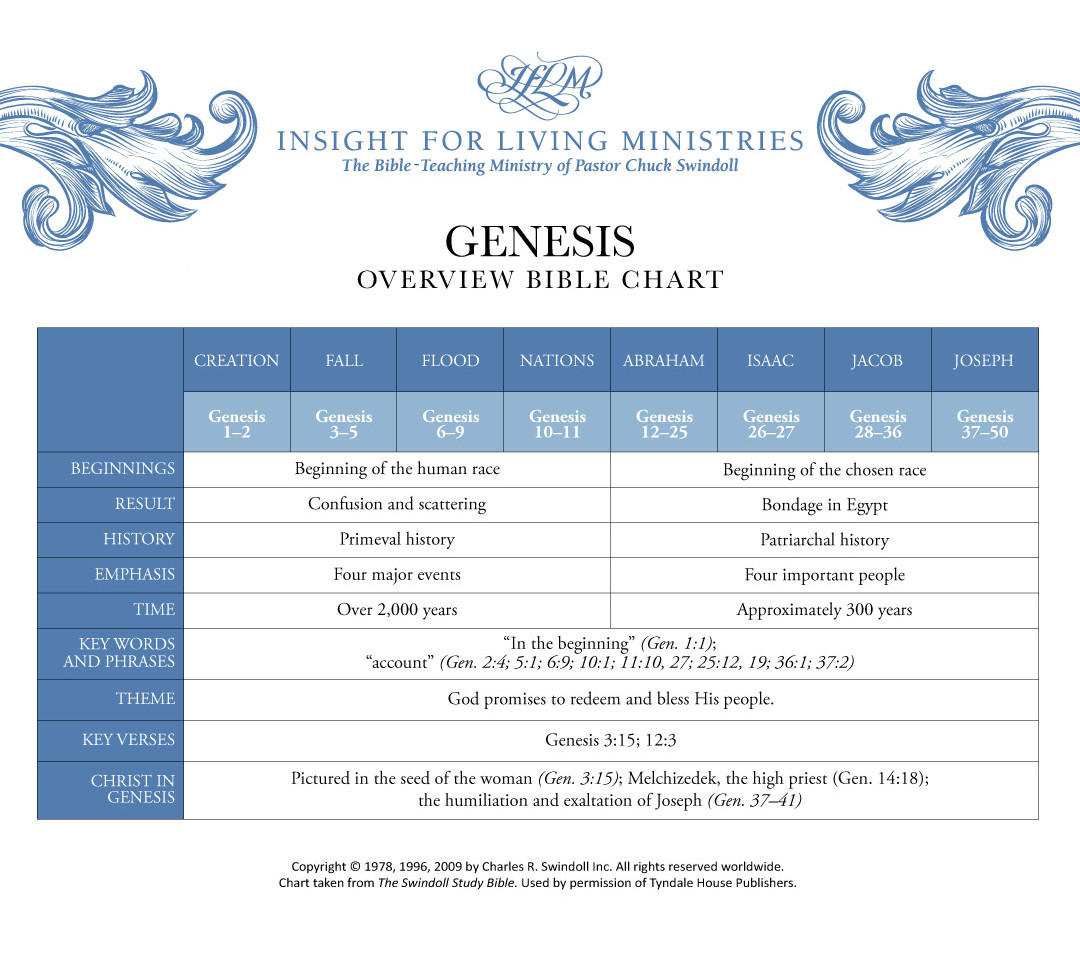 View Chuck Swindoll's chart of Genesis, which divides the book into major sections and highlights themes and key verses.